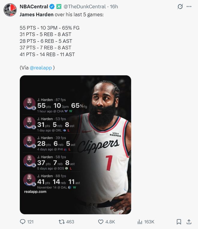 12.哈登过去五场比赛拿到192分,此前从未有36岁+的球员做到过;